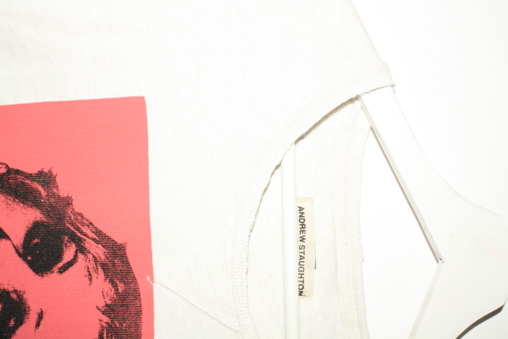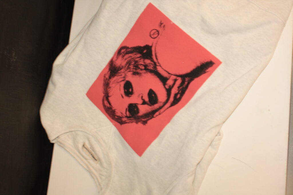 A recycled crew neck, screen-printed with two layers, sized roughly like a men’s medium. This colorway is a one-off and will not be repeated.